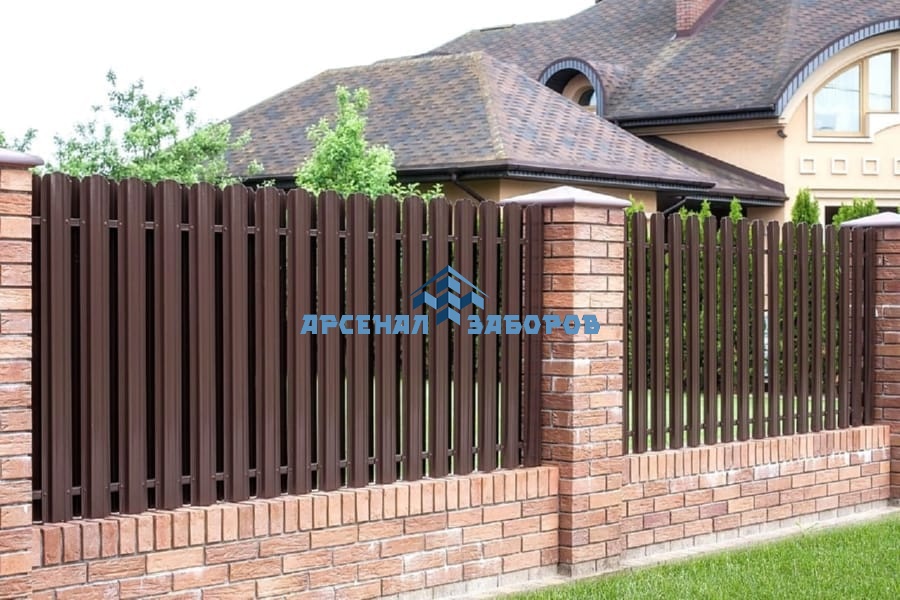 Забор из евроштакетника с кирпичными столбами