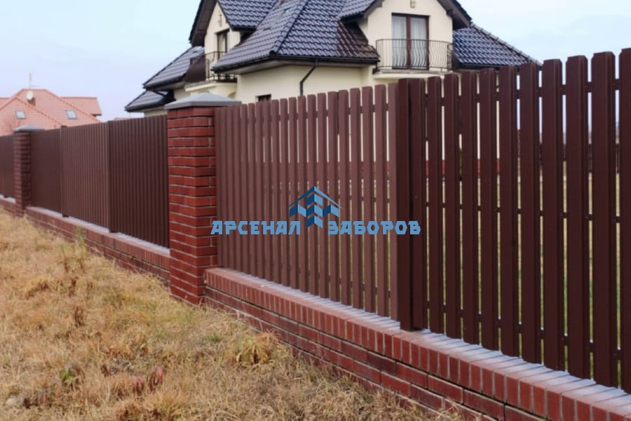 Забор из евроштакетника с кирпичными столбами